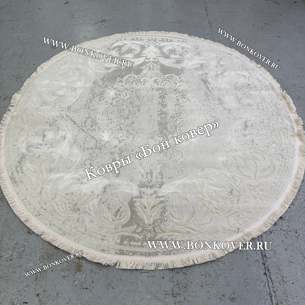 Изящный Белый Круглый Ковер Для Гостиной Медальон Дизайн 30533 наполняет интерьер гостиной теплом и уютом, гармонично сочетает в себе изящество и красоту. Он изготовлен из высококачественных материалов, комфортный и долговечный.